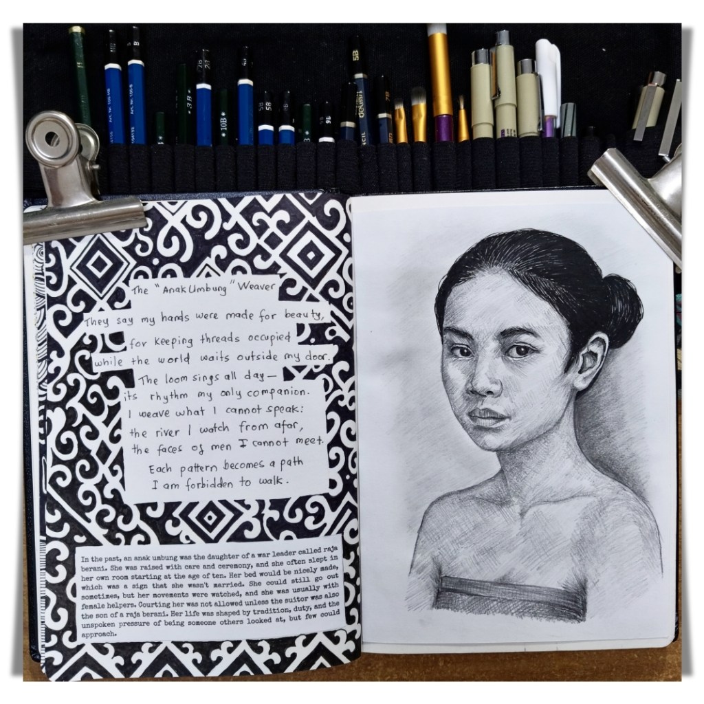 One of the first illustrations is inspired by women who sing to the moon as their laughter threads through the bamboo. Another drawing shows the anak umbung, the daughter of an Iban war leader who was raised apart from others and taught weaving skills. Her story has stayed with me, serving as a reminder of the beauty and self-control that once entwined women’s lives. There is also a drawing of a woman tending to the hearth before dawn. These aren’t big moments; they’re small actions that show tenderness, duty, and strength in Iban women.