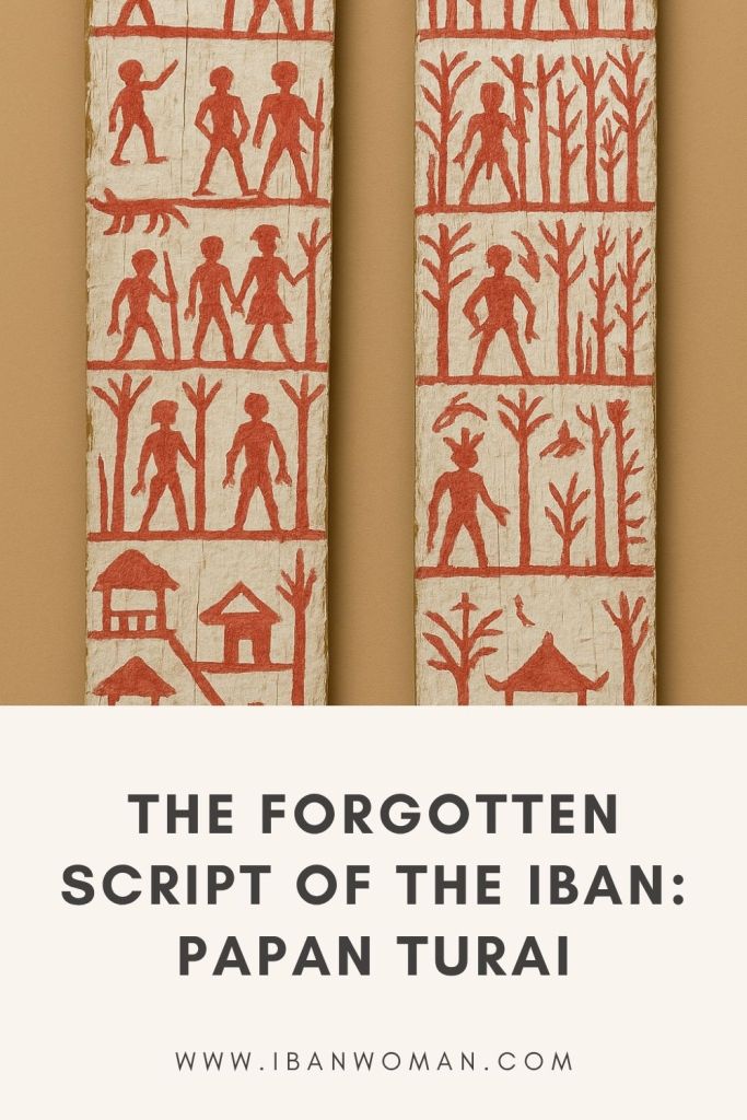 The majority of us are familiar with Egyptian hieroglyphics. However, not many people are aware that the Iban used to have their own type of pictorial writing. My ancestors’ written language, known as “turai,” is carved onto wooden boards called “papan turai.” During major festivals like Gawai Batu and Gawai Antu, lemambang (ritual bards) used these boards to recall and recite the pengap (folk epics), timang (invocations), and many other types of Iban poetry (leka main asal).