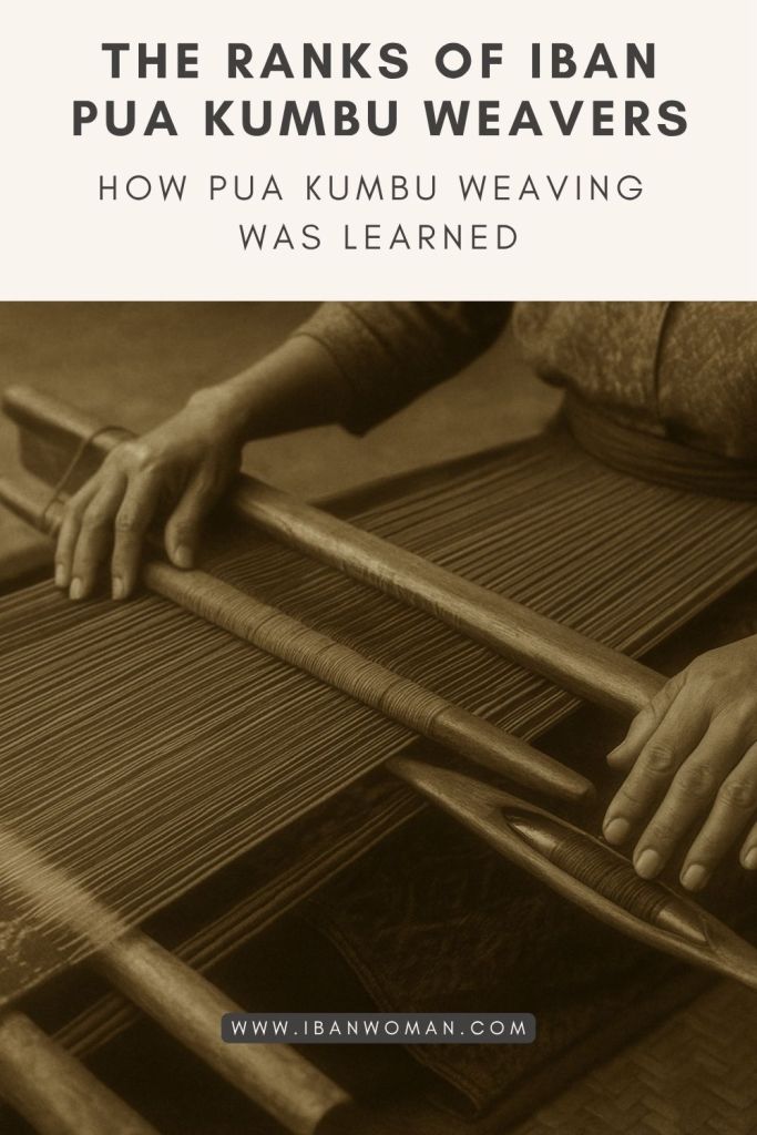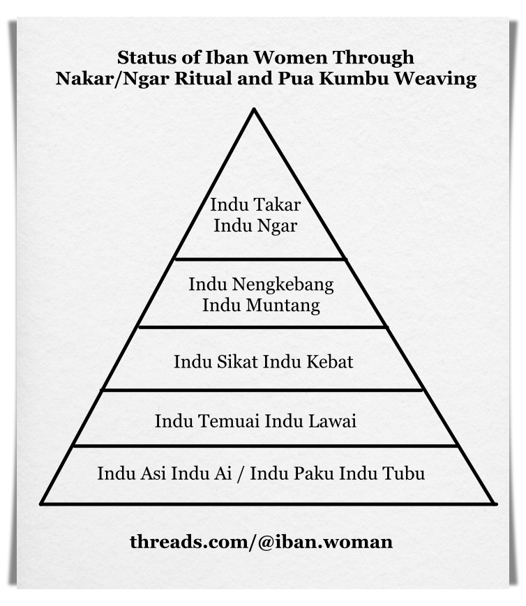 A higher rank is held by the Indu Nengkebang Indu Muntang. She is able to invent new designs, often revealed to her through dreams. She has the ability to attempt complex and spiritually demanding motifs. Her community respects her greatly, and she wears a porcupine quill tied with red thread as a mark of distinction. Other weavers pay her well for new motifs.