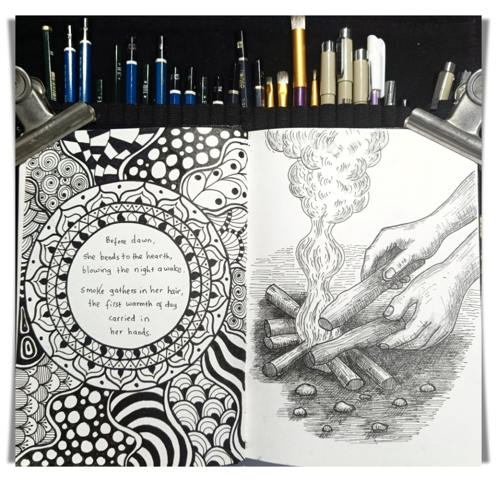 Every page will be hand-drawn using pencil and black fine liners, but for the actual zine they will be edited and printed. Drawing by hand has a grounding effect, allowing each line to have its own rhythm and imperfection. The only printed text will be the longer passages and explanations, saving space while keeping the design balanced. I have not planned the number of pages or illustrations yet. I like to let the process evolve spontaneously. Each piece generally begins as a poem or a brief reflection before taking on a visual shape.