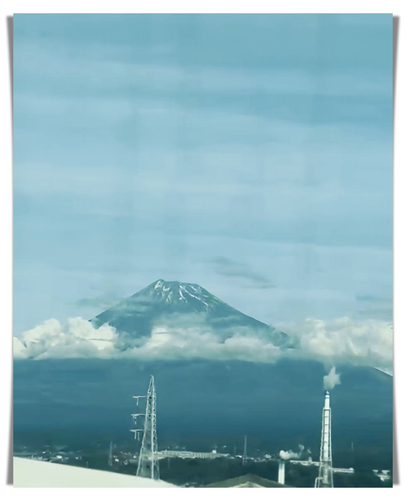 Mount Fuji appears in the distance. Clouds cover parts of it, but the top is still visible, white against a pale blue sky. At its base, the forest is dark and still. We pass rows of apartments. Laundry hangs outside, moving gently in the morning air. An ojisan adjusts his plants on a balcony. A woman walks slowly with a toddler, a shopping bag in her hand. Inside, a staff member pushes a cart down the aisle. The smell of food lingers faintly, a mix of sweet and savory. I reach into my bag for my notebook and pen. I pause and swallow.