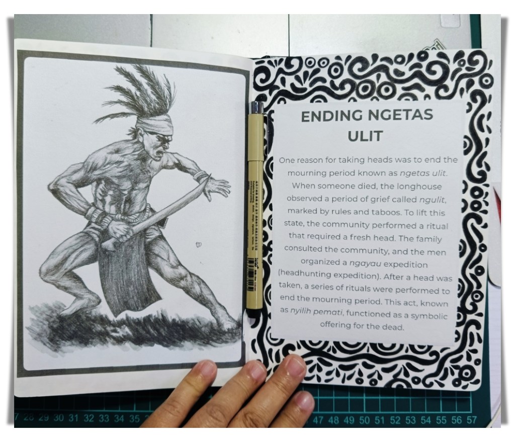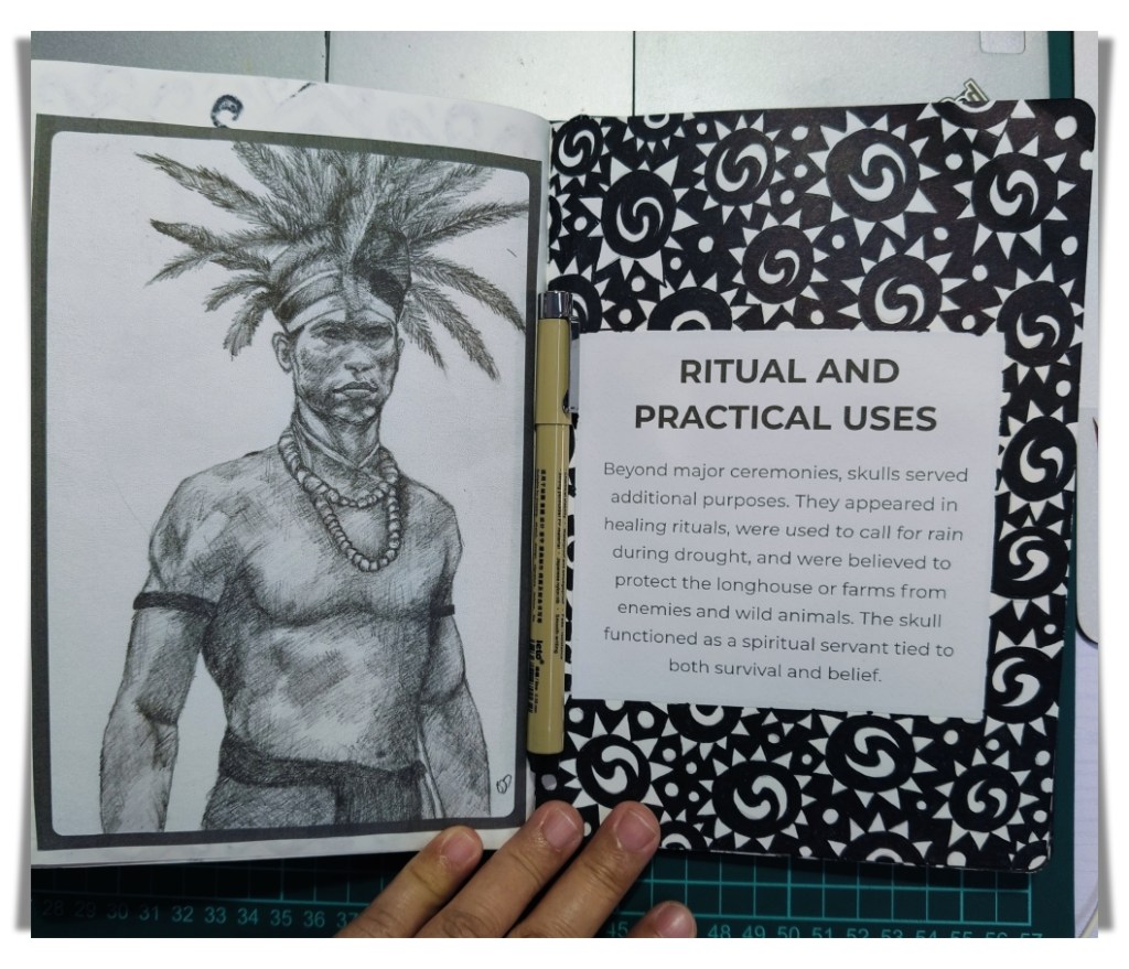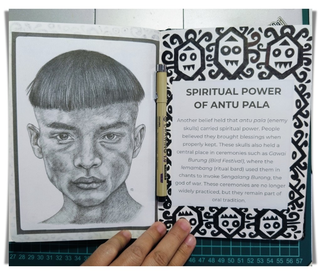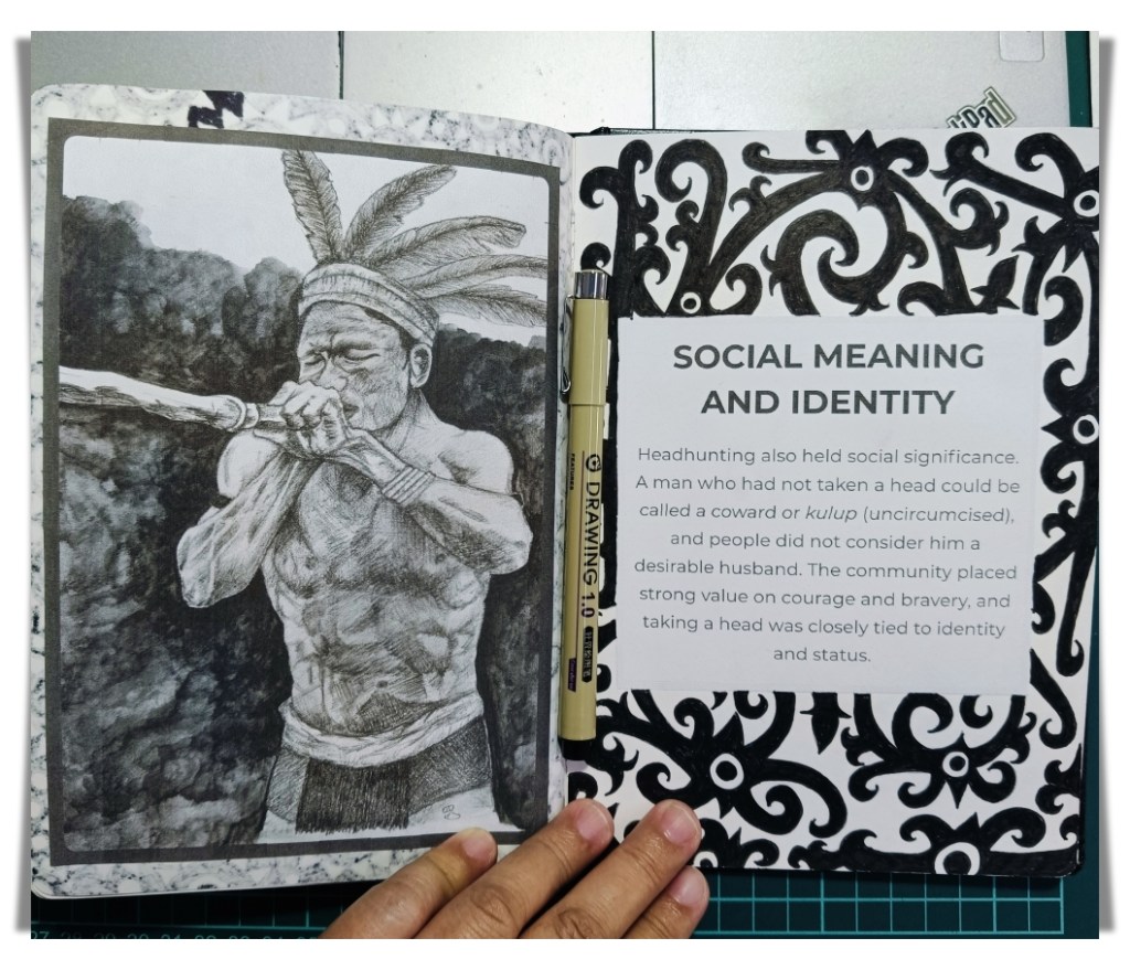 For instance, in these sketchbook pages, I talked about why the Ibans practiced headhunting in the past. It’s a difficult topic that people often misunderstand or only see one side of. I give it context instead of simplifying it. Each section describes a specific reason or belief and is paired with a hand-drawn drawing of an Iban warrior instead of an abstract idea. When I draw, it influences how I feel about the subject. When I sketch a figure, I pay attention to details that I would otherwise overlook.