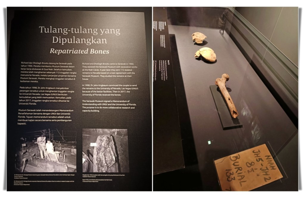 The repatriated bones from the Niah Caves were one of the first things that caught my attention. However, not all of the remains are displayed. Only fragments are shown, including one from Burial 133, which is part of the Neolithic cemetery found in the cave’s West Mouth. This site has one of the largest prehistoric burial cemeteries in Southeast Asia. Excavations in the 1950s and 1960s, as well as more recent studies, have found more than a hundred burials here. The University of Nevada used to keep these bones for research and safekeeping, but they have since been returned to Sarawak. I visited Niah Cave in my youth, and I have read about these bones in the past, and standing right beside them felt so surreal.