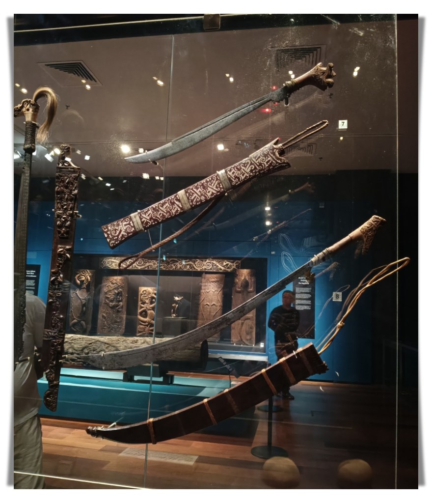 These swords were historically used for headhunting. While I was lingering near this exhibit and admiring their craftmanship, my husband had a different experience. He told me later that he felt a strong impulse, as if a voice was urging him to take one of the swords and kill someone. He felt so uncomfortable that he quickly left this section. I didn’t experience anything like that, and I believed him when he told me. The Iban people believe that such swords need to be kept properly, and certain rituals need to be conducted to appease the restless spirits of the swords.