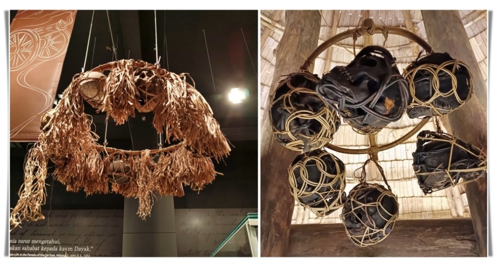 Finally, there were the skulls. These are real human skulls from Sarawak’s headhunting past. They are arranged in round rattan frames decorated with dried leaves. This collection is known as a tampun and is traditionally hung in the longhouse. Some of my relatives still keep them. The Iban people believe that the souls are still present, thus they should be treated with care. My family no longer keeps them, as my great-great grandparents gave up these practices after converting to Christianity in the early 20th century.